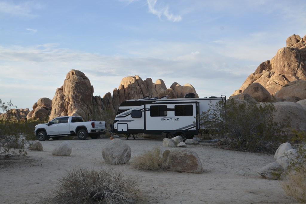 Indian Cove Campground, tucked into a quieter corner of Joshua Tree near the town of Twentynine Palms, was our home base. It’s about a 30-minute drive from the main park entrances and doesn’t offer hookups (hello, dry camping!), but it was peaceful, scenic, and just right for our two-night stay. Heads-up for future travelers: if you’ve got a larger rig, book early and do some digging on location. Campground spots in the park can be a bit tricky! Reserve through Recreation.gov up to six months in advance.