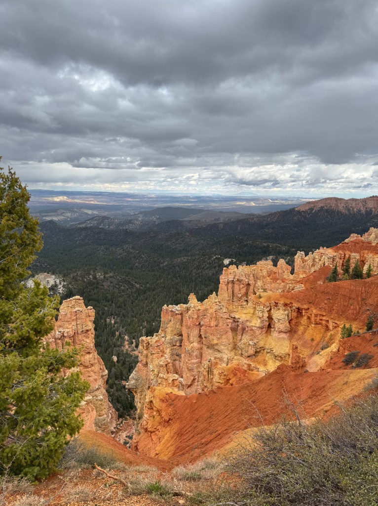 We started our adventure at Bryce Canyon, where the Scenic Overlook Drive became our warm-up for the trip. This road winds along the rim, with pullouts to some of the most jaw-dropping vistas in the park. Each overlook felt like its own unique work of art — the hoodoos shifting in shape and hue even as the sun gave way to rain and snow!