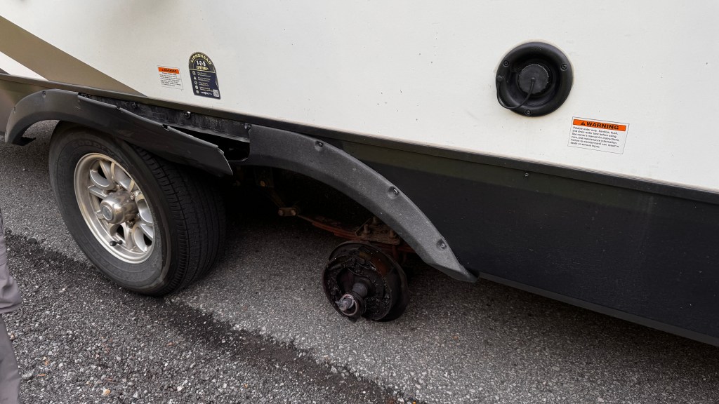 Glen’s tried everything to find us a used axle, but no luck. The timeline? Six to eight weeks. Yikes. Sam tracked down a brand-new axle from Lippert (the original maker), and thankfully it could be shipped in just two weeks.